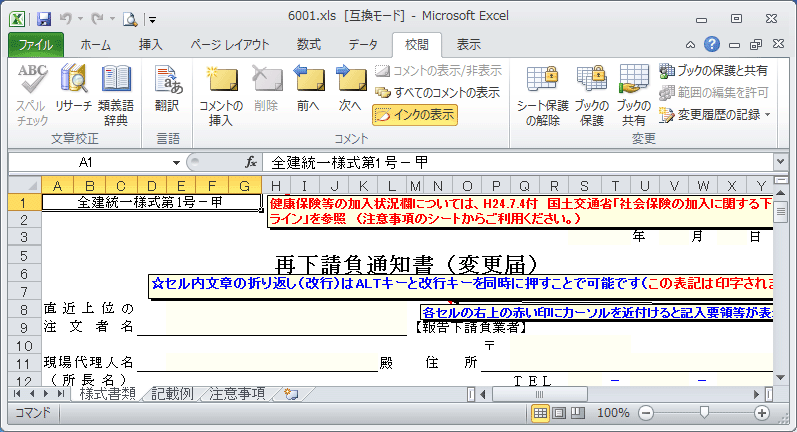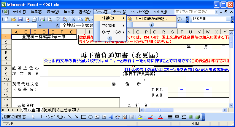 ※体裁を変更した様式書類ファイルは当サポートの対象外となることをご了承の上、保護を解除してください。